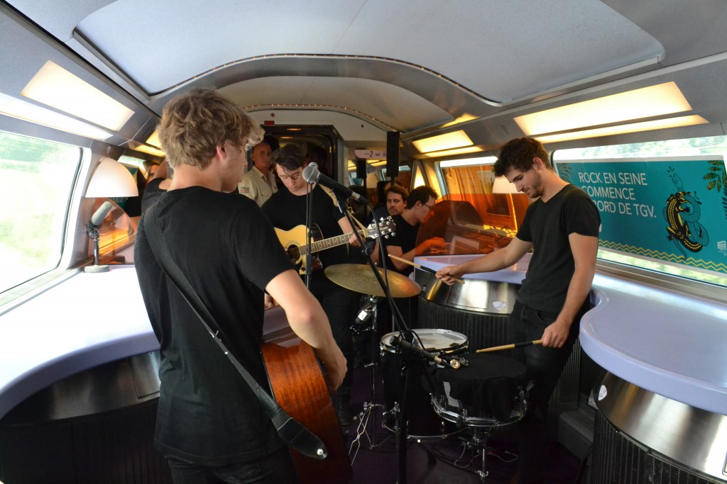 Pour rallier le festival, un TGV spécial était affrété pour l'occasion avec un concert du groupe français Last Train. Le groupe alsacien a multiplié les festivals cet été, Québec, Colmar et Pau, avant de retrouver Rock en Seine. Le départ est donné en gare de Lyon Part-Dieu ce vendredi 26 août à 15h. Trente minutes plus tard, le concert de Last Train débute. Installé dans le wagon bar du TGV, le quatuor propose un rock 'n' roll hypnotique dans un univers écorché et maîtrisé, issu de leur premier EP "Cold Fever". Malgré l'exigüité du lieu, le groupe a réussi à jouer une trentaine de minutes avec une énergie débordante sous les yeux des voyageurs contents.
